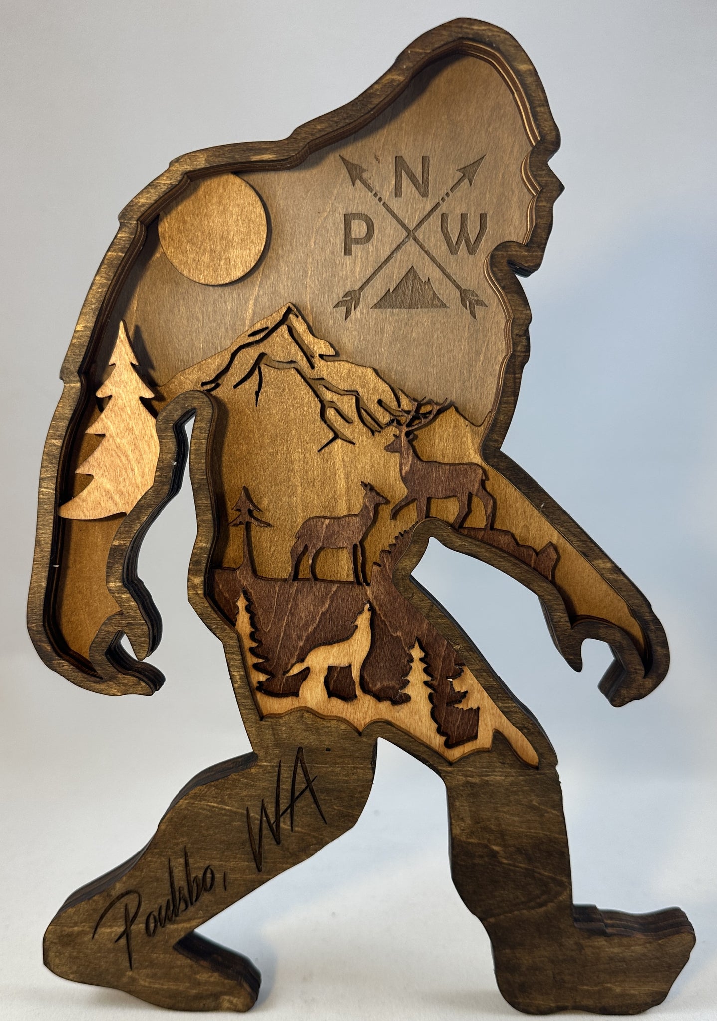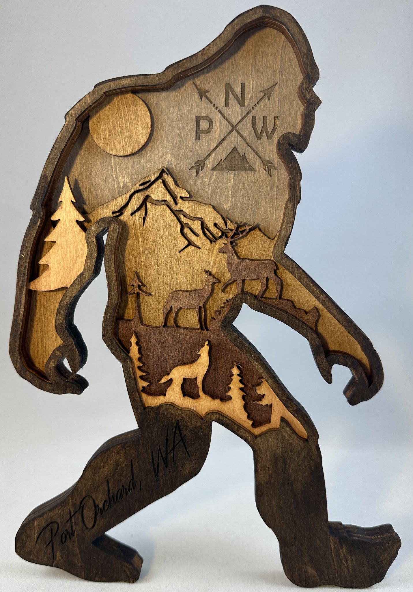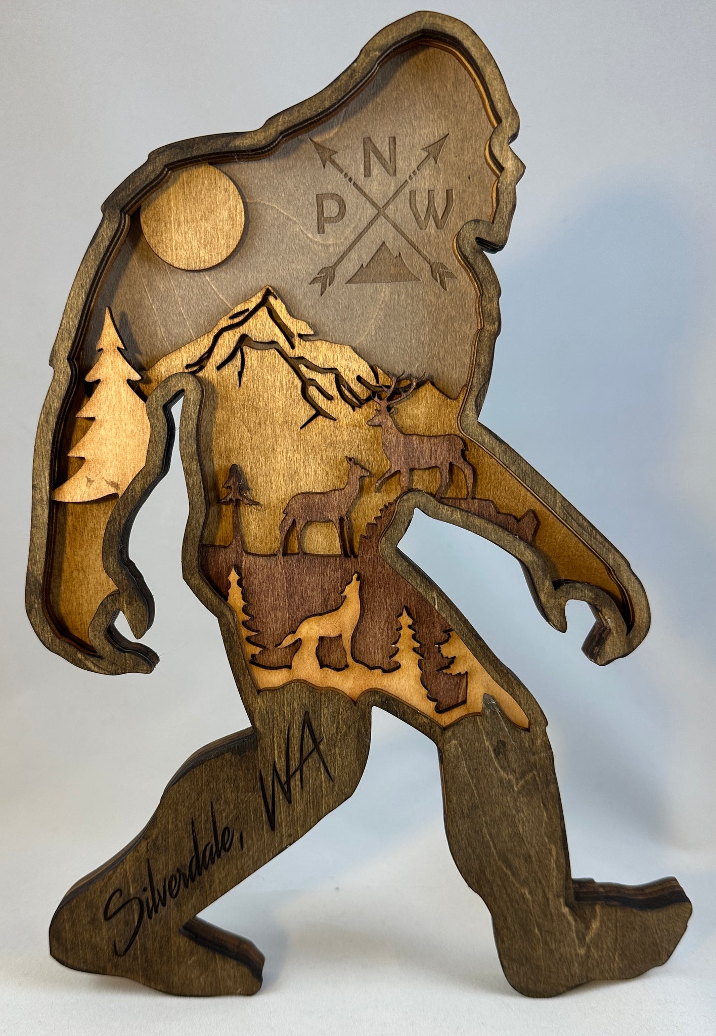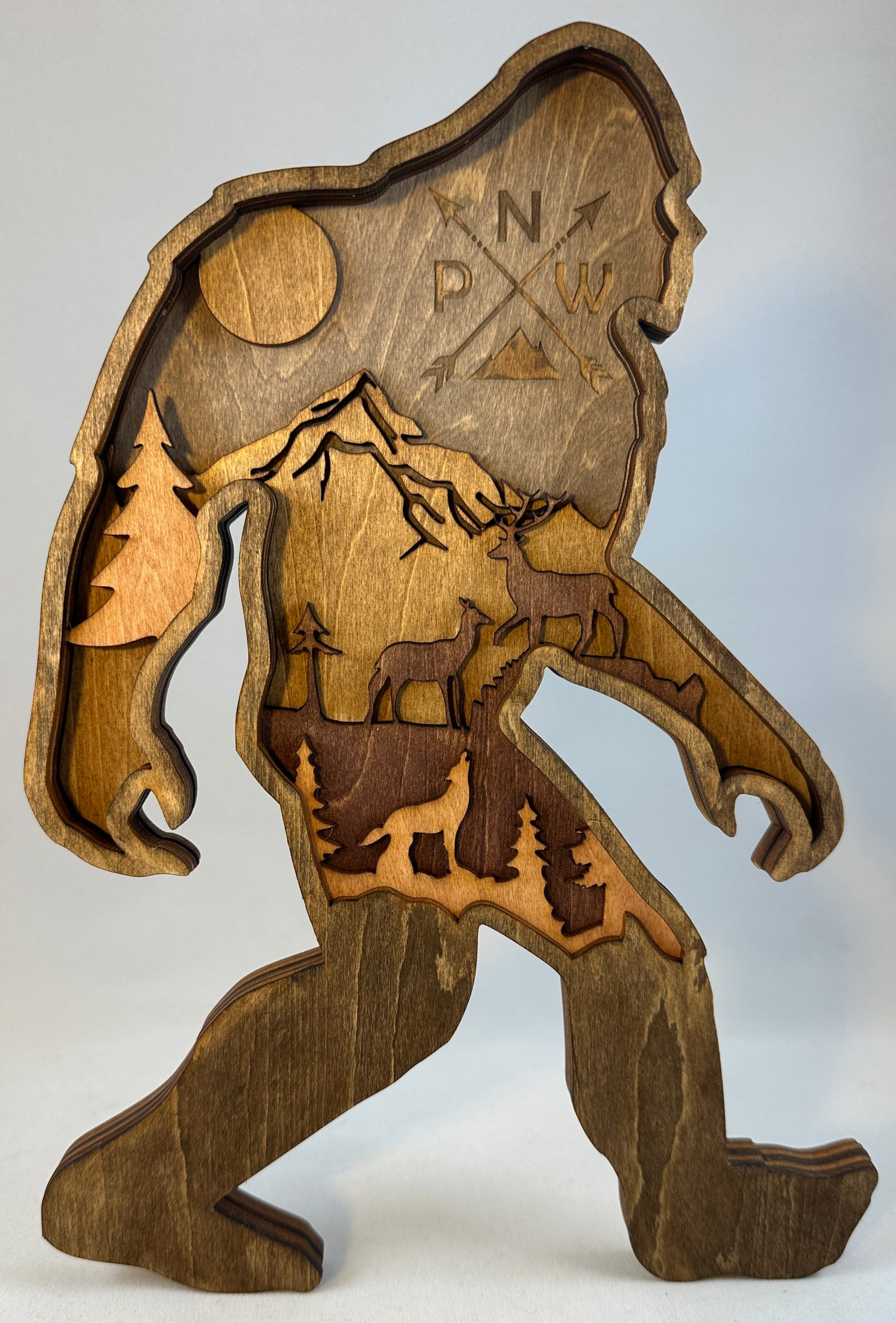 Showcase your love for the unexplained, supernatural, mythical, and outdoors with our handmade 11.5 inches tall, 8 inches wide, laser cut and engraved Bigfoot. Embrace the beauty of the mountains and trees with this captivating 3D layered wooden Big Foot sculpture. Hand stained and glued ... this comes fully assembled. Mountains, sky, deer, a wolf, and trees, all layered inside Sasquatch. A great gift for anyone who loves the outdoors. Larger sizes can be made upon request.